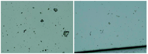 Figure 2 shows an aqueous fraction image from Pfizer vaccine sample (left) and from reduced graphene oxide (rGO) standard (right) (Sigma-777684). Optical microscopy, 100X