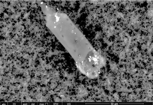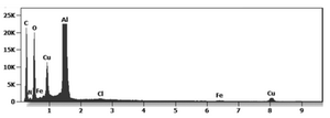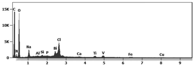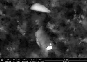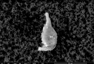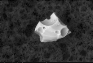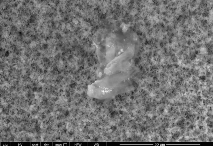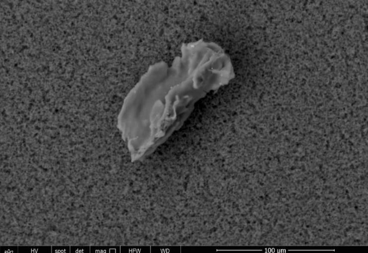The white 2-micron-long particulate is composed of bismuth, carbon, oxygen, aluminum, sodium, copper and nitrogen.