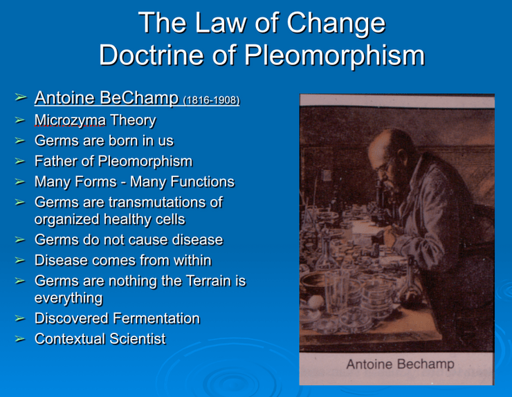 Germs Are Born In Us and From Us as an Outfection and NOT an Infection of the Body Cells. In other words germs are symptoms of cellular and genetic disorganization and NOT the specific cause of the cellular and genetic disorganization! The GERM is NOTHING and the TERRAIN is EVERYTHING . Germs can only contribute to a state of toxic imbalance but NEVER cause ANY specific sickness or disease![55] – Dr. Robert O. Young