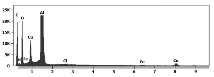 The Pfizer vaccine liquid fraction was then analyzed for chemical and elemental content using Energy-dispersive X-ray spectroscopy (EDS) as seen in Figure 6. The EDS spectrum showed the presence of Carbon, Oxygen verifying the rGO elements and Sodium and Chloride since the sample shown in Figures 2, 3, 5, and 6 were diluted in a saline solution.