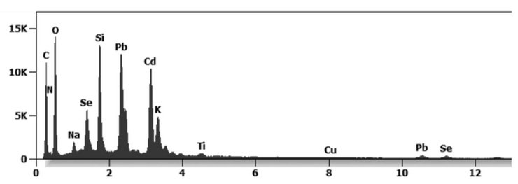 Figure 29 shows they are composed of carbon, nitrogen, oxygen, silicon, lead, cadmium, and selenium. This highly toxic nano particulate composition are quantum dots of cadmium selenide which are cytotoxic and genotoxic.[13][14]