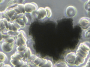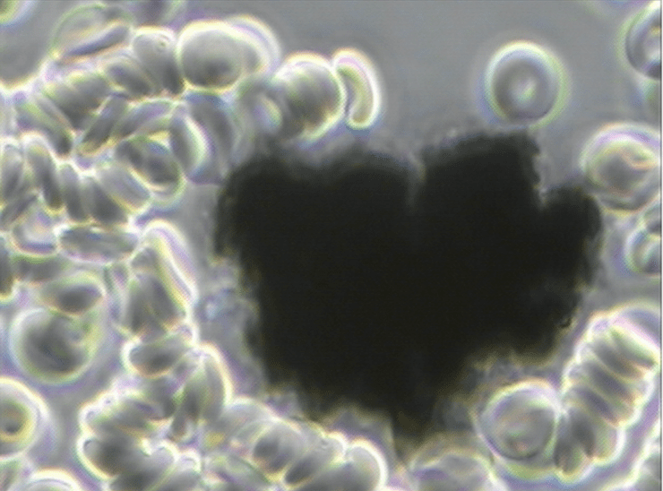 Figure 1 is a Micrograph of a Carbon Cluster of Reduced Graphene Oxide (rGO) Viewed in the Live Unstained Human Blood with pHase Contrast Microscopy at 1500x. Note that the Red Blood Cells are Clotting in and Around the rGO Crystal in a Condition Known as Rouleau! A French Word Which Means to Chain.