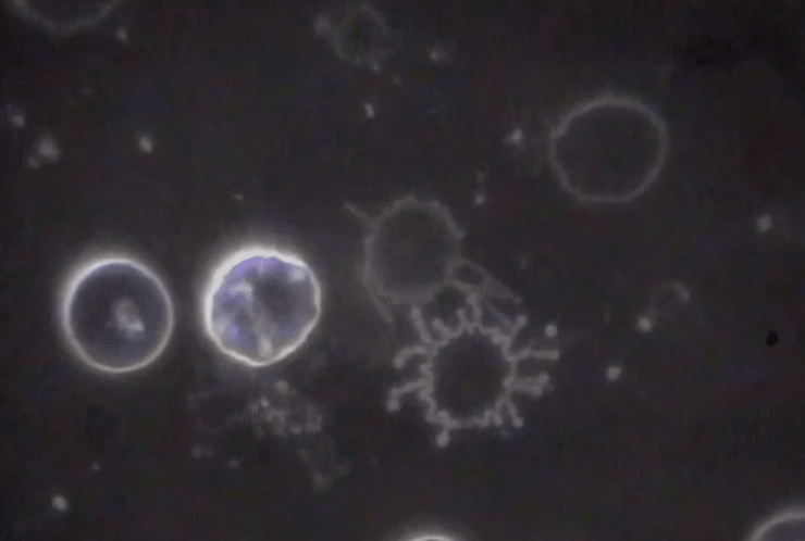 Figures 22 and 23 shows an organic-inorganic aggregate identified in the Janssen “vaccine”. The particles are composed of stainless steel and are glued together with a “Carbon-based glue” of reduced graphene oxide.[10] This aggregate is highly magnetic and can trigger pathological blood coagulation and “The Corona Effect” or “The Spike Protein Effect” creation from the degeneration of the cell membrane due to interactions with other dipoles.[10] You can view these biological reactions or cellular transformations in the live blood under pHase Contrast and Dark Field Microscopy in Figures 24, 25 and 26.[1][11]
